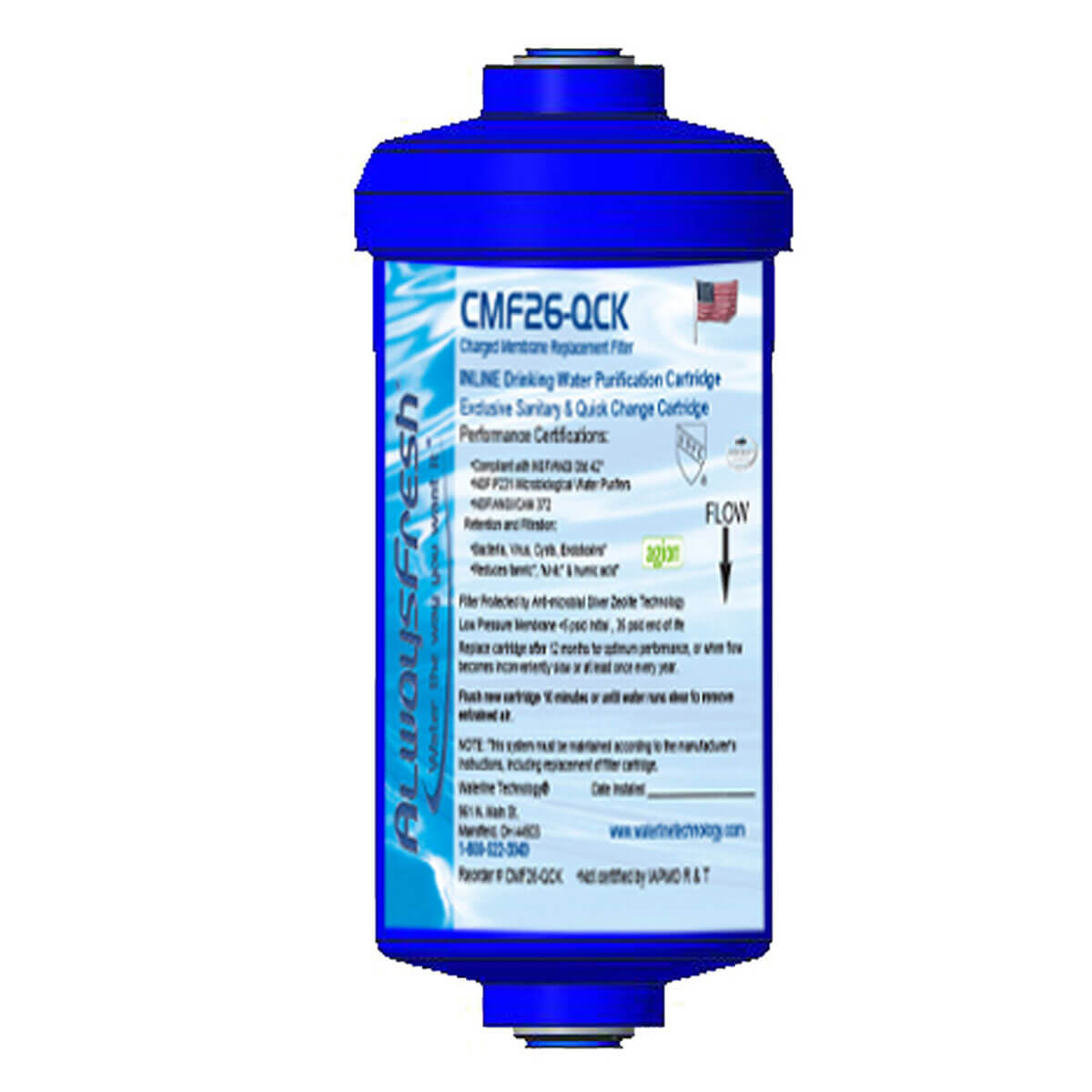 • Stage 4: CMF26-.75 QCK inline microbial filter is installed after the storage tank to reduce bacteria/viruses. 3/8” built-in quick-connect fittings.